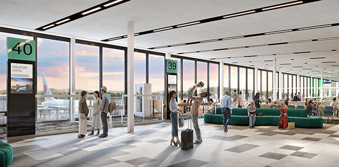 Lead image: A render of the departure lounge at Gold Coast Airport.