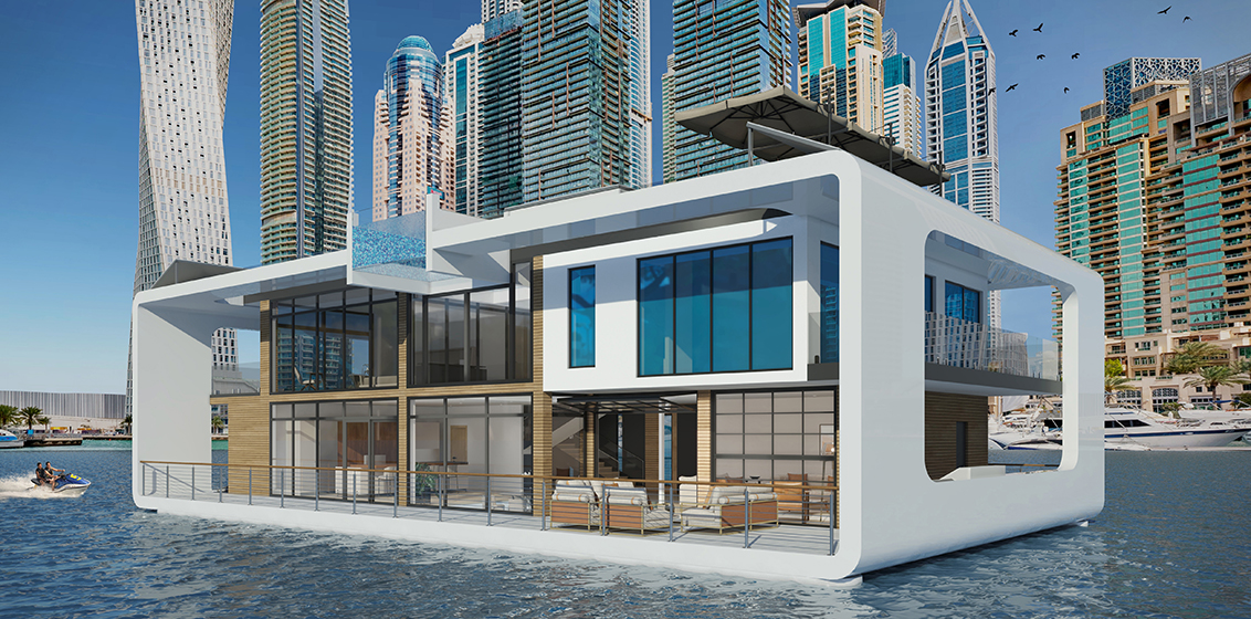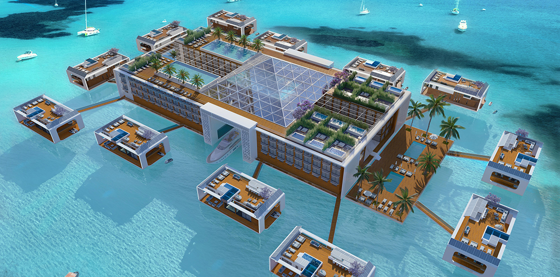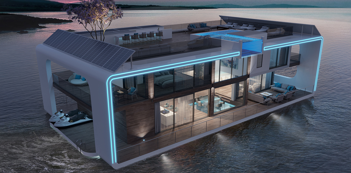 The 12 luxury villas, connected by pontoons, feature a roof terrace and infinity pool, each with two, three or four bedrooms, crew and staff rooms. What are effectively glamourous houseboats, the villas offer indoor and outdoor living rooms with large panoramic windows, and all the modern cons of a smart home. They can sail at a maximum speed of 6 nautical miles, and come equipped with solar panels and are designed to be environmentally friendly.