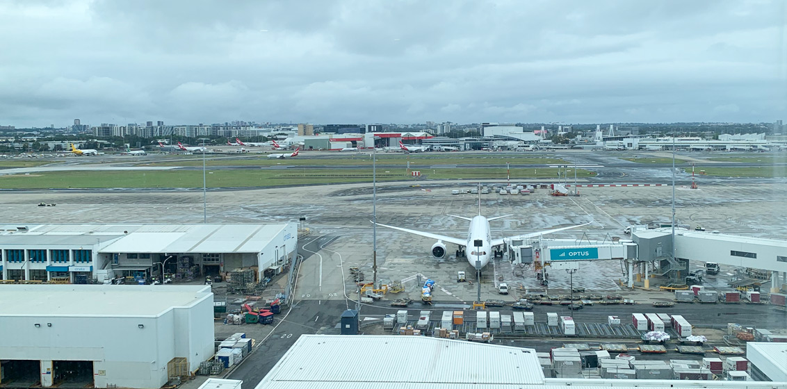 My room tonight is an overly spacious King Suite on level 8, overlooking the runway. For aviation buffs, it doesn’t get any better. Floor-to-ceiling windows look directly down onto Kingsford Smith’s Gates 8, 9 and 10, and across to the domestic terminal. Two chairs and a small table face outwards, providing the ideal perch to plane watch. A similar view is experienced even while laying on the bed. There’s a writing table, sofa and coffee table, mini-bar fridge, tea & coffee facilities – all the staples.