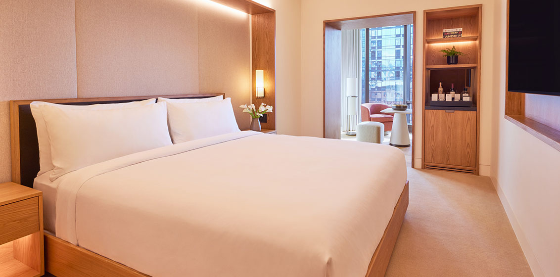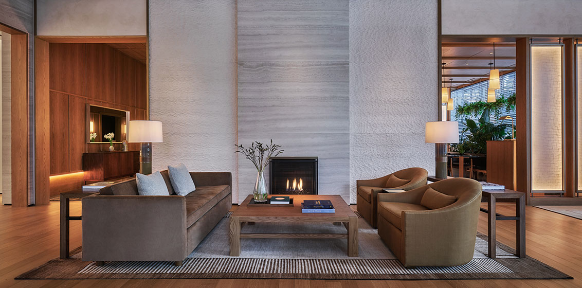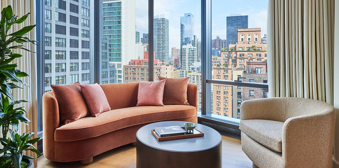 Lead image: The Pendry Manhattan West – Skyline Corner One Bedroom Suite, sitting area.