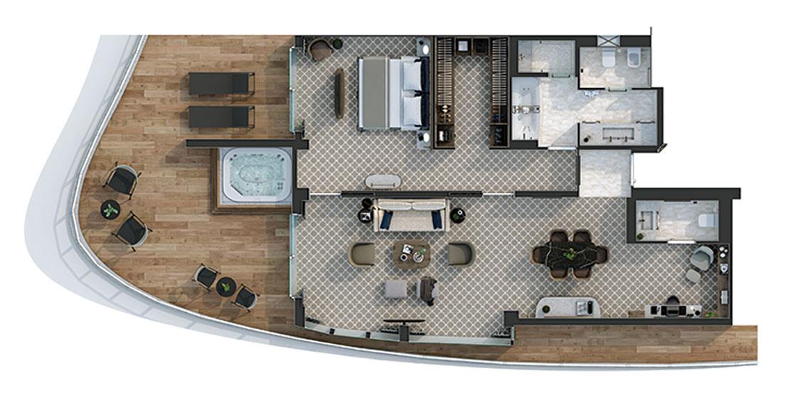 LATTE can reveal those accommodations includes a brand new suite category – the One-Bedroom Otium Suite. At 123 square metres (including a 40 square metre veranda), the Otium Suite will be positioned at the stern of the ship and be around 20% larger than the highest category suite on Silver Dawn.