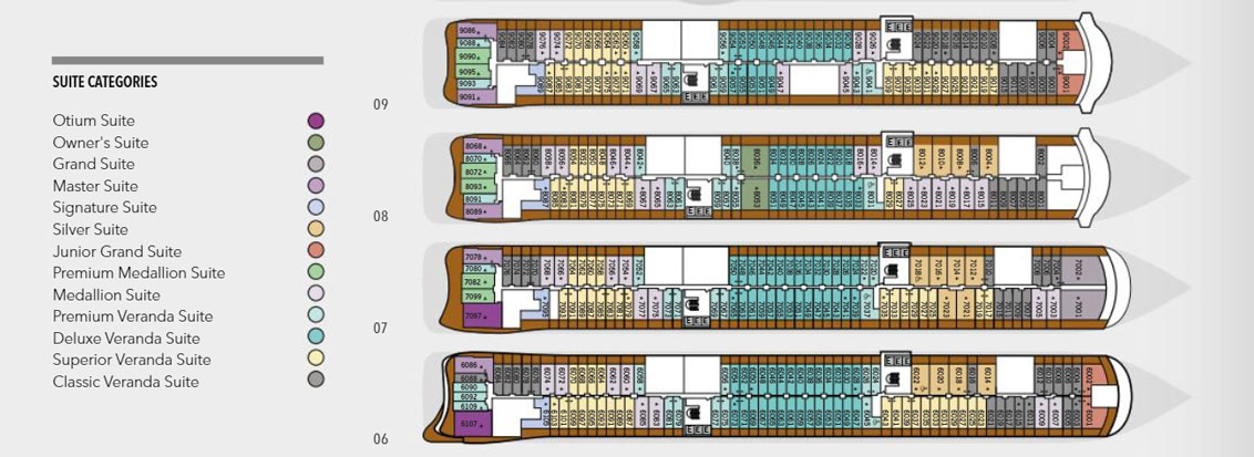 Other new Suites include the 80 sqm Master Suite – exclusive to Silver Nova – and newly introduced Medallion Suites and Premium Medallion Suites.Deck plans indicate there will be two top-of-the-line Otium suites on Decks 6 and 7 that will feature separate living and dining areas, two balconies (double the size of the Owner’s Suite balconies), a private hot tub, indoor whirlpool, spacious bedroom, and more.