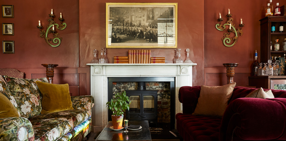 Drink, and eat, in the brand-signifier giant conservatory attached to the main house. Your well-scrubbed old-wood table bears a living strawberry plant, and yummy herb-infused olive oil, plus local butter. The chef, Kamil Oseka, one of few non-Brits making this PIG so memorable, is immediately keen to show off his pickling room, fruits of a passion learned from his grandmother back in Warsaw: he takes you through the kitchen and wants to talk for ages about how he started pickling here in early Summer 2021. We were later brought some pickled one-bites with the ‘Piggy Bits’ (crackling strips with tiny dollops of applesauce), ordered to go with cocktails. We sat in the Drawing Room, a lounge with William Morris-look wallpaper matching sofas’ upholstery.