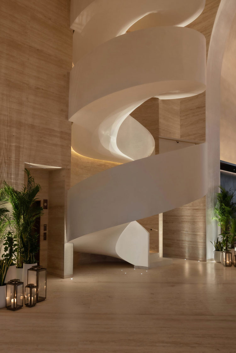 Guests are immediately drawn to the centrepiece, a seamless triple spiral staircase (pictured), a truly unique design statement that connects the lobby to other public spaces.