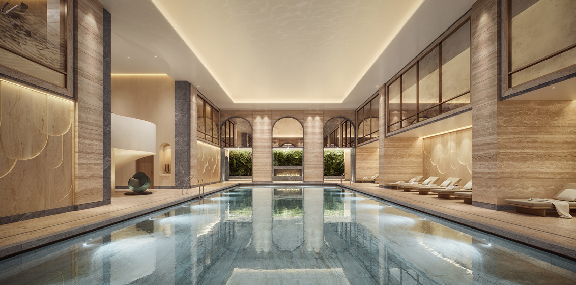 The active wellness spaces, driven by PILLAR, comprise an extensive gym and yoga studio, juice bar, striking 20m swimming pool complete with a vitality pool and steam and sauna rooms.