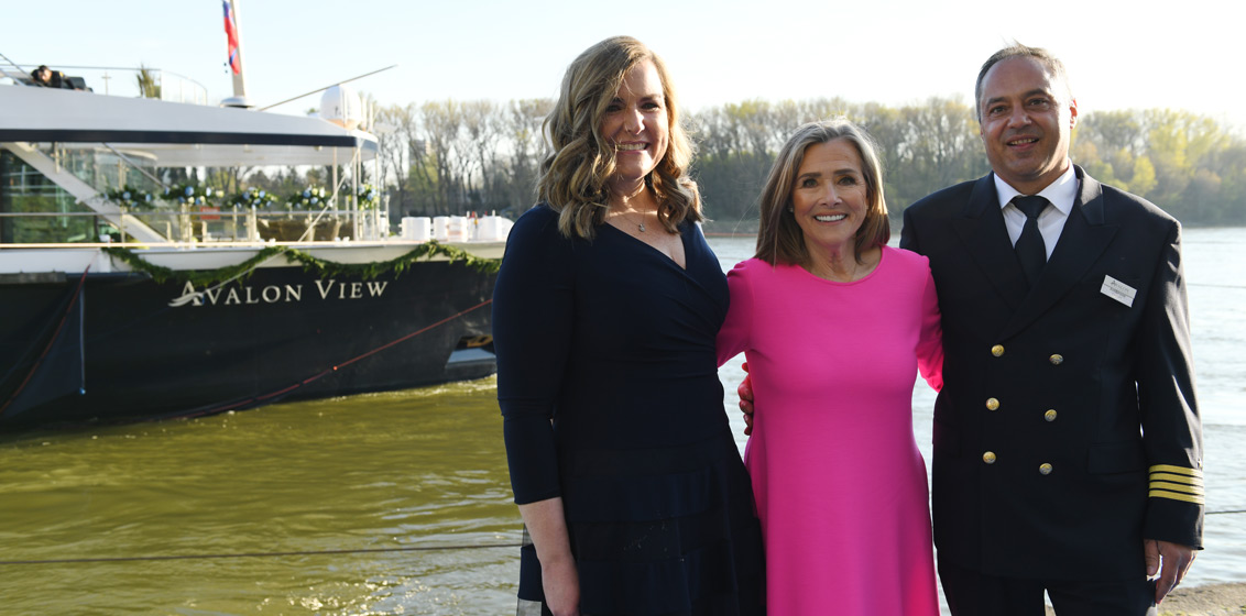 Lead image: Pam Hoffee, Managing Director, Avalon Waterways and Captain Ambrose Manolache with Avalon View Godmother, Meredith Vieira.