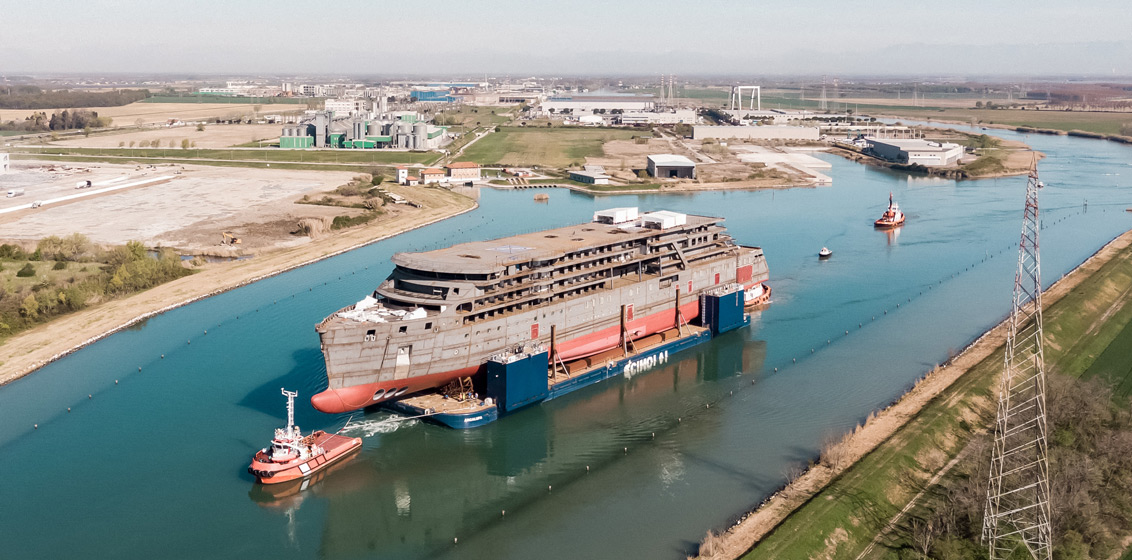 The hull was moved onto a special barge on 6 April and began the 1,200 nautical mile journey to Genoa on 15 April. Seabourn Pursuit has been under construction at the CIMAR shipyard in San Giorgio di Nogaro and is already equipped with engines, generators, and main equipment of the engine rooms.