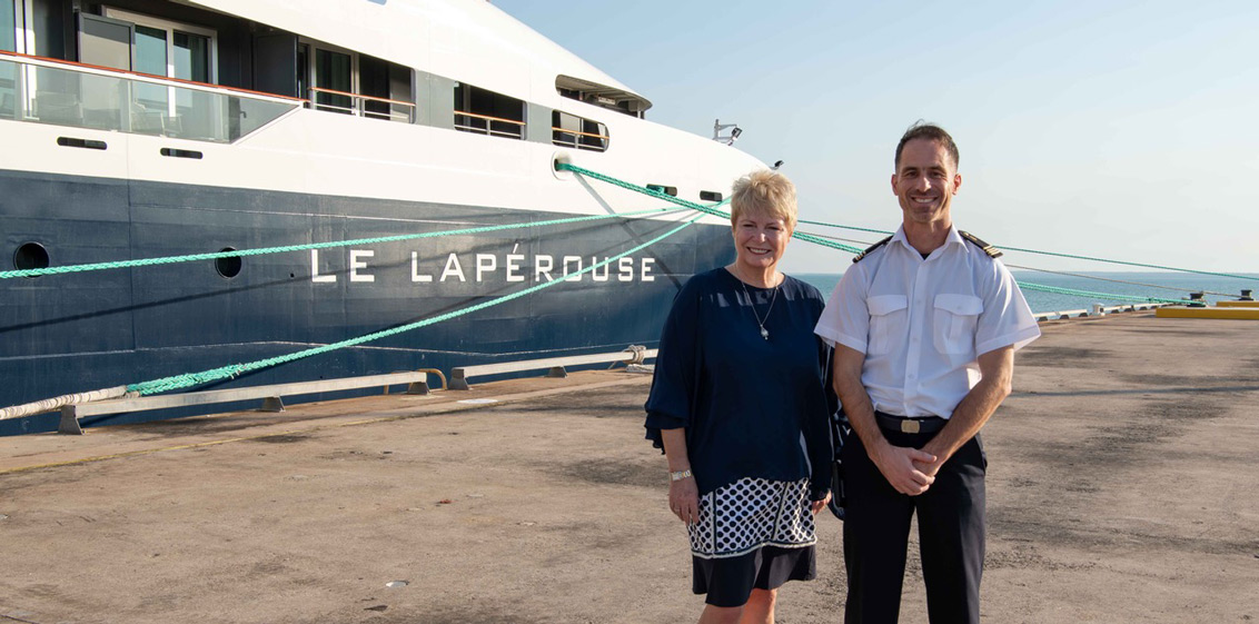 Sarina Bratton AM Chairman for PONANT Asia Pacific, met with Captain Xavier Rutten in Darwin on Monday 25 April to welcome the ship, a few days before the inaugural sailing of the almost sold-out 2022 Kimberley expedition season.