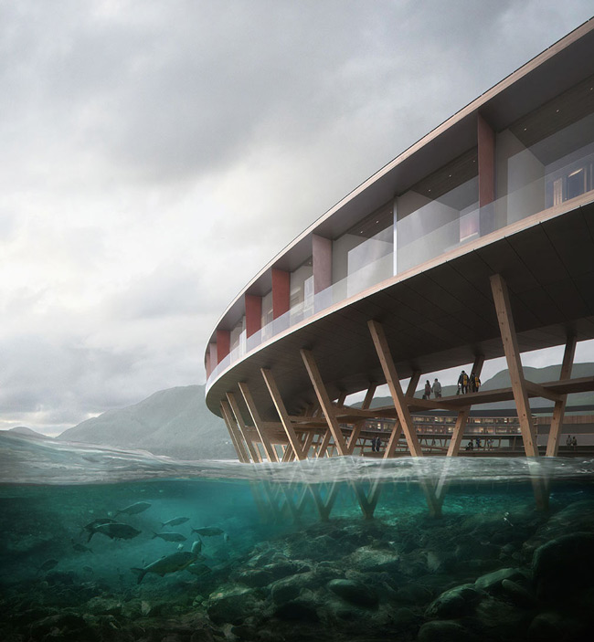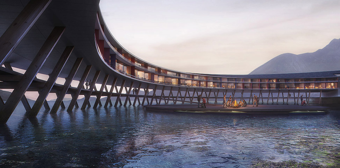 Taking its cue from the “fiskehjell” (an A-shaped wooden structure for drying fish) and the “rorbu” (a coastal fisherman’s cabin), Six Senses Svart will be constructed on poles, eliminating the boundary between land and fjord, ensuring minimal land impact and seabed disruption. The circular form is tactile, creating a feeling of openness and perpetual consciousness of nature as it gives the building a transparent appearance. The roof not only provides panoramic views and privacy, but enables an expanded distance between rooms for rooftop solar collection.
