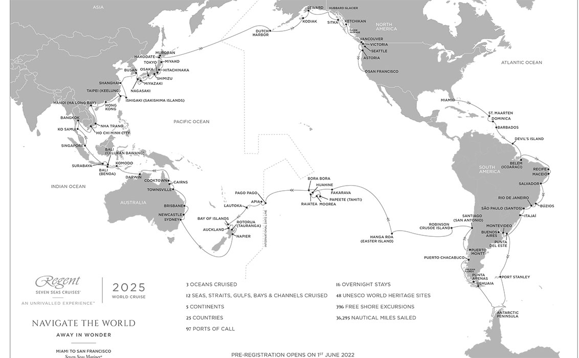 Regent Seven Seas Cruises has revealed details of its longest-ever World Cruise, a 150-night voyage sailing between Miami and San Francisco via South America, the South Pacific, Australia, New Zealand, Asia and Alaska. Departing on 7 January 2025, the cruise will be aboard Seven Seas Mariner.