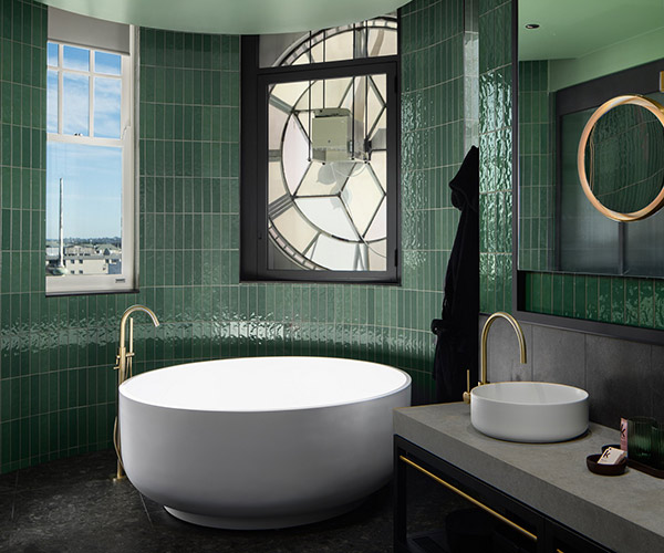 A natural light-filled sanctuary fixed in time within the building’s iconic dome and clock face steals the scene; the Clock Suite boasts uninterrupted harbour views, enhanced by the suite’s centrepiece restored in its former glory. A designer bathroom dripping in indulgent extras sits pride of place featuring a lavishly oversized bathtub surrounded in emerald green finery.