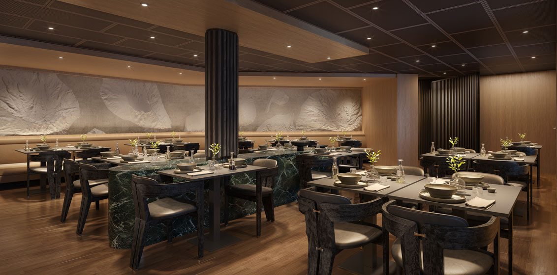 Broadening Silver Nova’s offering of international fare, the 86 sqm Kaiseki will serve the finest Asian cuisine in a minimalist, Japanese-inspired setting on deck four, accommodating 40 guests in a tranquil environment. A new set of modern design features will enrich the space, from the restaurant’s entrance, which will act as a symbolic gateway to Japan, to its decoration, which will incorporate authentic washi paper, marble, and traditional wooden materials. Elegant lighting will create a cosy, inviting atmosphere for optimum intimacy. Primarily serving Japanese fare, Kaiseki will also offer guests the chance to sample fine Vietnamese, Thai, Indian, Korean, and Chinese cuisine from an a-la-carte menu.