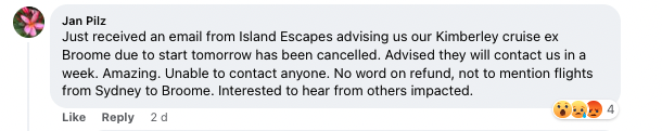 Feedback from impacted guests shared on Island Escape Cruises’ Facebook page indicates there was no forewarning that their 3 July cruise would not be proceeding, with some guests either already in Broome or in transit to the Western Australian city in anticipation of boarding the intimately sized 30-guest ship.