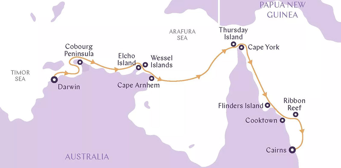 The local program also includes a one-off 11-day Arnhem Land & Great Barrier Reef expedition from Darwin to Cairns (view the map below), departing 13 August 2023 and priced from $13,903 per person twin share.