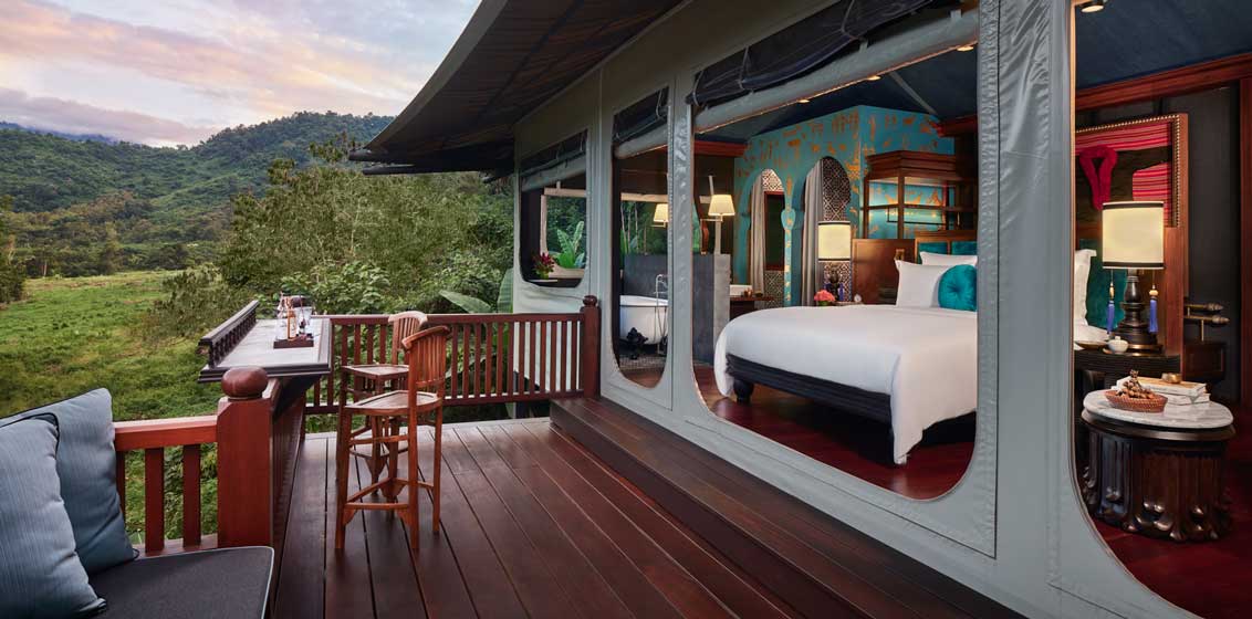 Bordered by a riverbank, the resort offers 23 spacious accommodations including four deluxe rooms, four specialty suites, three riverside villas, six pool villas and six luxury tents, which include their own private dining areas and wrap-around decks.