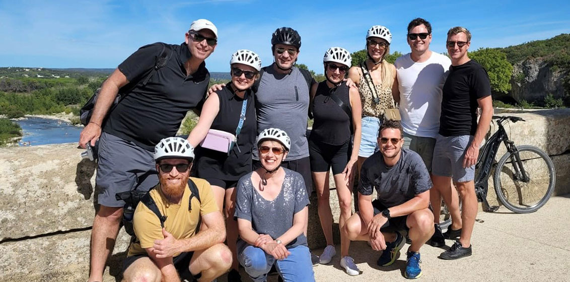 Lead image: Pictured on the iconic Pont du Gard bridge while on an e-bike cycle tour, from left are – Jason Heartly, Business Leader Global Leisure Merchandising & Revenue Management; Chris Bissett; Megan Henderson, Global Marketing Operations Leader, Flight Centre Brand; Kim Price, Ray Hands, Business Development Manager – FCTG Independent; Selena Byrnes, Global General Manager Travel Services for FCTG; Kelly Spencer, MD of Supply Operations; Mitch Spencer, Global Account Manager Globus Family of brands; Clinton Hearne, Global Head of Marketing, Flight Centre Brand and Daniel Hahne.