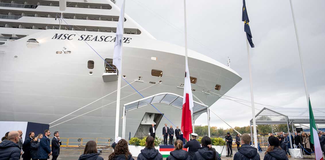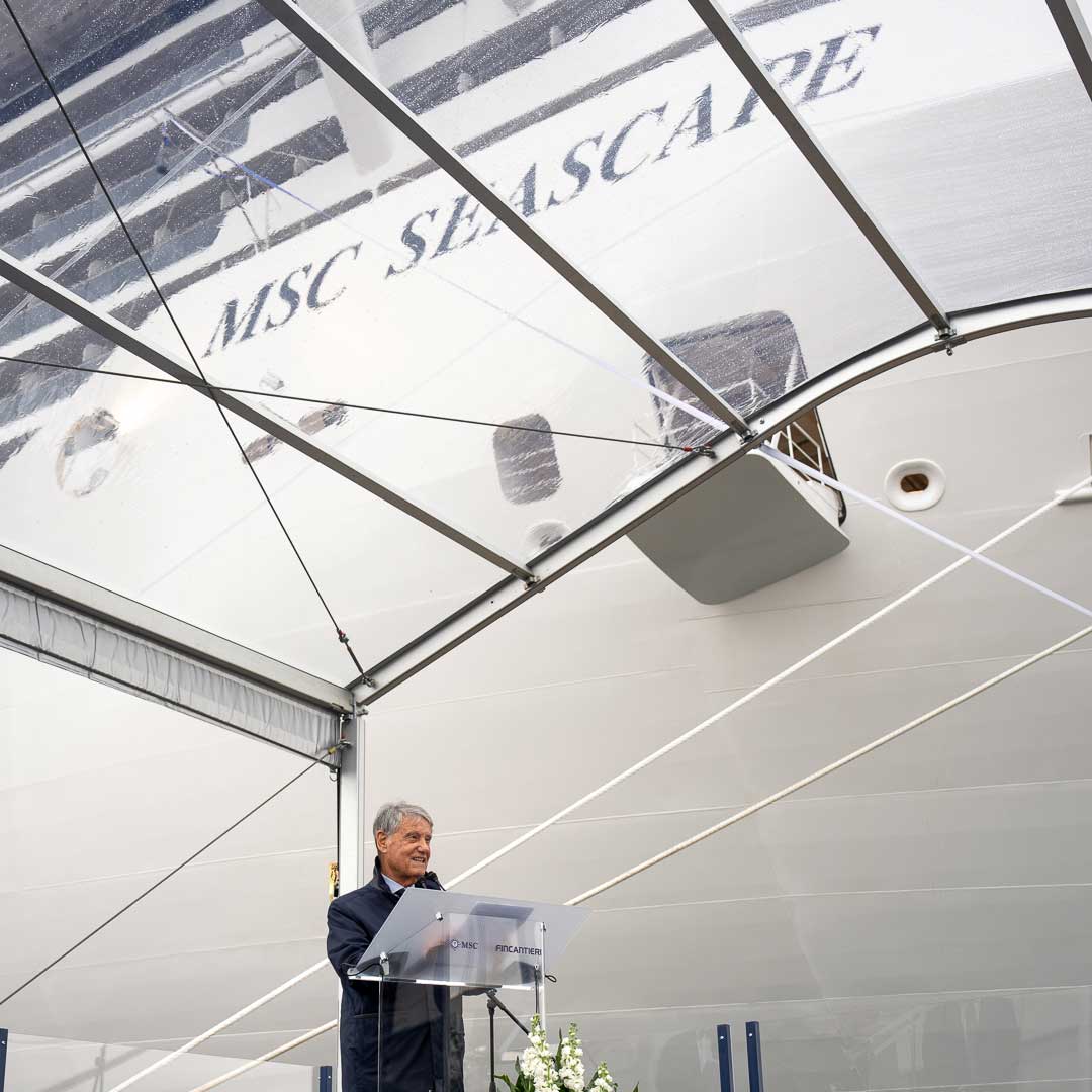 During the ceremony, Cristiano Bazzara, Fincantieri’s shipyard director, presented to Captain Roberto Leotta, Master of MSC Seascape, an ampoule containing the water that first touched the hull when the ship was floated out earlier this year.