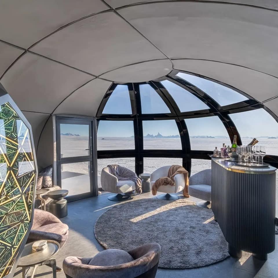 The central hub, known as ‘Cosmos’, is formed of four separate rooms all connected by tunnels that resemble a docking station to a spaceship. Inside, the ‘sky pods’ are no less futuristic, with vast windows that bring the landscape of Antarctica inside each lounge, bar or dining space.