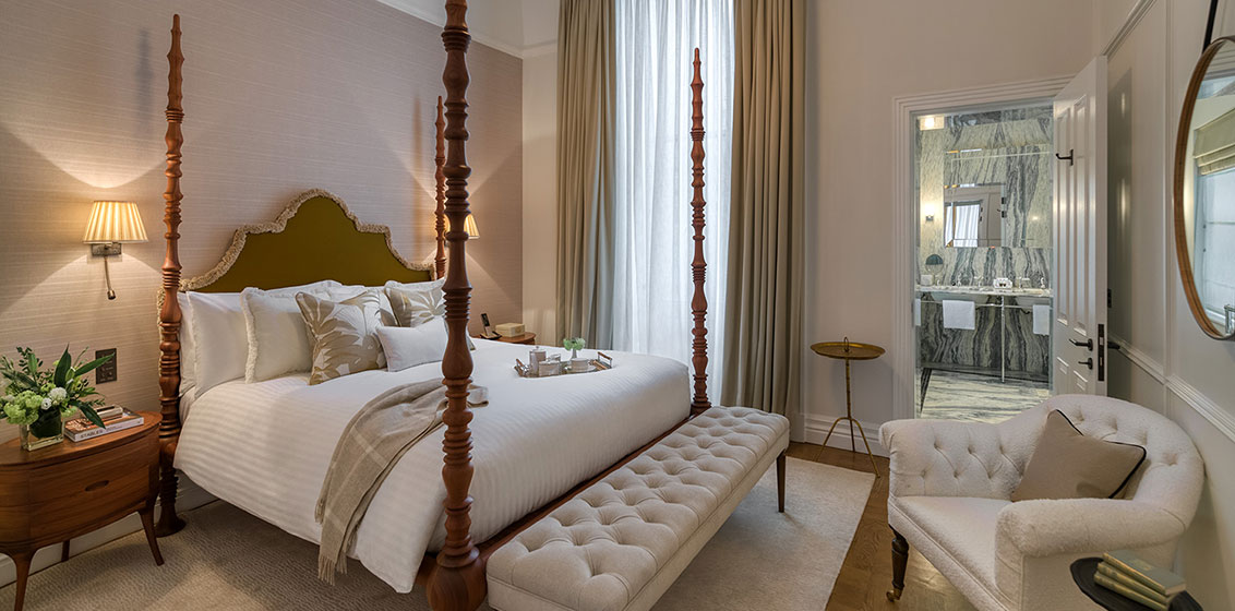 Elizabeth, up 90 carpetted stairs for those who eschew the elevator, is themed for Queen Elizabeth II, with a larger-than-life wall-hung collage of her unmistakable silhouette, crown atop. There’s a four-post bed, with no top tester. You have superbly rich double-chocolate biscuits, by Border. The tea kettle is Smeg, the toiletries are quintessentially English, Bamford. This lesson in national mores is enhanced by the really deep soaking tub, which has Victorian plumbing in the form of a baton-like waste stopper that has a mind of its own.