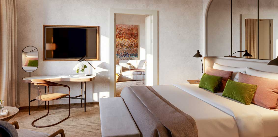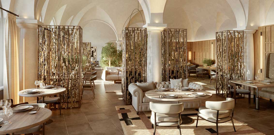 The Bar and Lounge area on reception level will be transformed with contemporary lighting, statement rugs made from natural fibres, and comfortable low-slung furniture in cream hues. At the main restaurant serving traditional Mediterranean flavours and wood-fired pizza, dramatic latticed metal dividers and monastic boiserie panels will be added for a visual separation from the lounge area and to create a more intimate atmosphere for the diners.