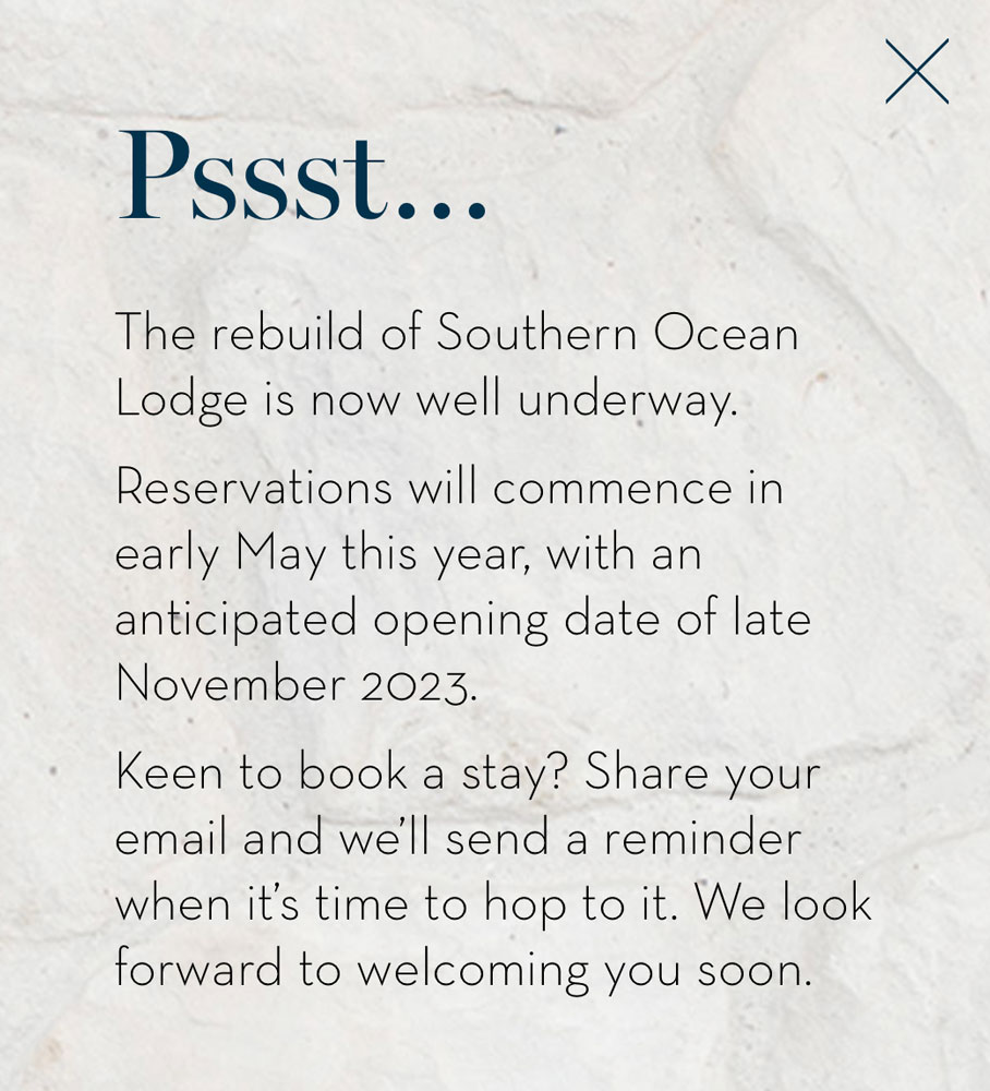 Ground was broken on Southern Ocean Lodge 2.0 just over 13 months ago. Bradbery wouldn’t divulge when SOL 2.0 would reopen, however, LATTE can reveal reservations have been flagged to open in May 2023, for an earmarked debut in late November 2023.Ground was broken on Southern Ocean Lodge 2.0 just over 13 months ago. Bradbery wouldn’t divulge when SOL 2.0 would reopen, however, LATTE can reveal reservations have been flagged to open in May 2023, for an earmarked debut in late November 2023.