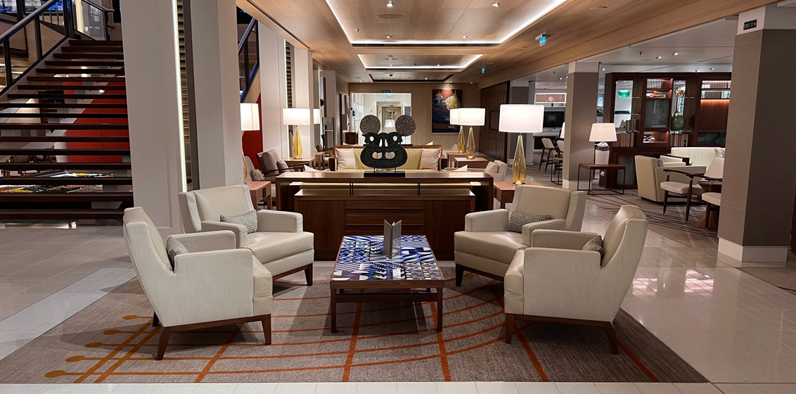 The Nordic influence of the brand’s heritage is rampant, with light, bright and airy spaces throughout, aside from the darkened Torshavn jazz lounge and bar. There is a consistent use of wood furniture and wood accents, and dozens of different shapes, styles, sizes and textures of seating across the public spaces, lounges, sitting areas, bars, restaurants, bars and cafes. We’d need to do the math, but it seems like there’d be enough options to sit in a different style of chair every day on a 79-day Sydney-Vancouver ocean cruise itinerary from Australia to Alaska!