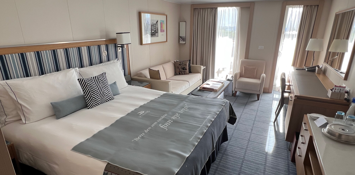 LATTE‘s abode for the journey was a Penthouse Veranda stateroom on Deck 6. This is Viking’s highest-rated stateroom and it’s not hard to understand why. At 31 square metres and including a 6 sqm Veranda, there is an abundance of space, with a wide two-seat sofa, an armchair, coffee table, a large desk with a clever pop-up vanity mirror, side tables with extendable platforms (for storing larger devices while you sleep I assume), a large bathroom with a decent sized shower, heated flooring and very comfortable bedding and pillows. Admittedly, I am travelling solo, but even with a second traveller there would be more than enough shoulder room here. Plus there is lots of closet space and shelving, and the number of draws would keep the longest world cruiser more than content. At 25% larger than Viking’s lead-in Veranda stateroom, it’s a highly recommended upgrade.