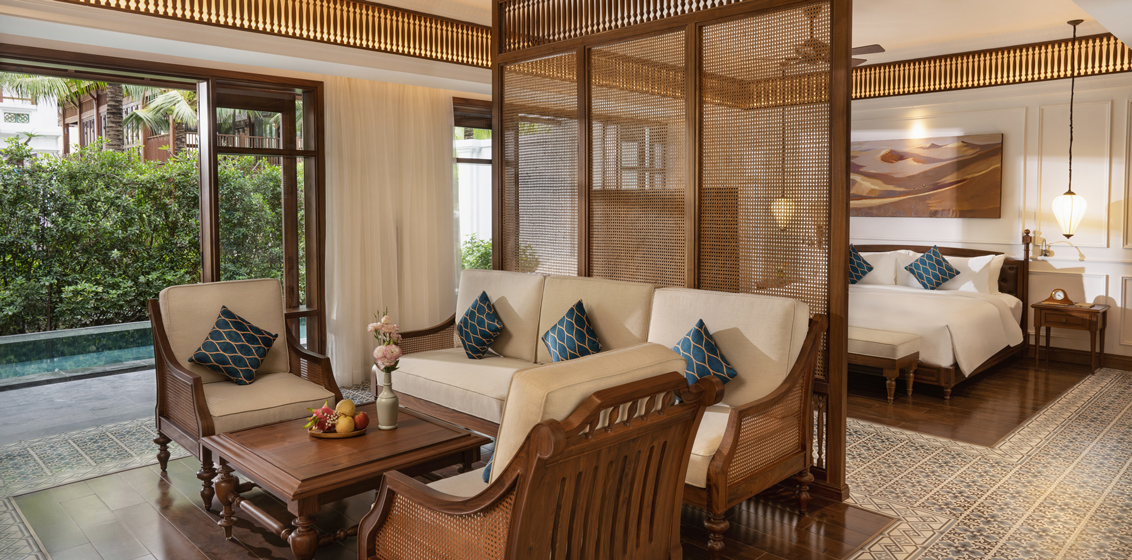 With architecture inspired by the grand French villas in Hanoi and the garden homes of Central Vietnam, the resort pays homage to both colonial-era and classic Vietnamese aesthetics such as customised encaustic mosaic tiles, Cham decorative vases and statues on plinths, teak furniture crafted from sustainable forests, stone from Thanh Hoa and Nghe An, and authentic thatched roofs from Binh Thuan.Vietnamese artists were commissioned to create 250 oil paintings depicting scenes of Vietnamese life for each room and suite, in addition to the lobby, restaurants and hallways.