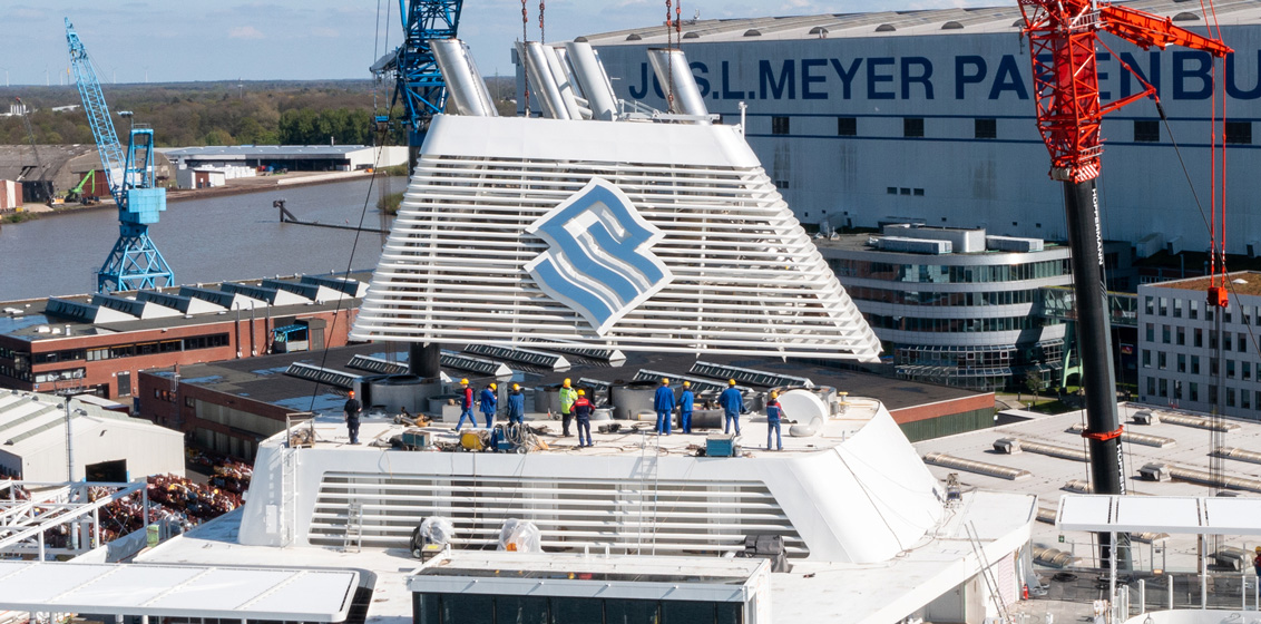Meyer Werft’s skilled craftspeople cleaned the ship’s hull, attached her funnel, and installed her LNG and radar masts. Unique to the Meyer Werft shipyard, Silver Nova’s next journey—scheduled for the end of May—will entail a conveyance of 32km down the narrow Ems River to the sea.