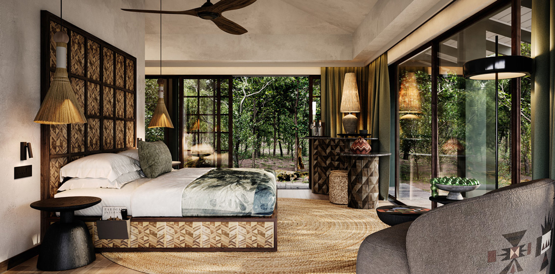 Elements of the natural forest and Zulu culture will be brought into the room through the use of tactile textures and natural materials such as woven matting, textured grass cloth wallpaper, and hardwood floors, with natural stone tiling in the bathrooms.