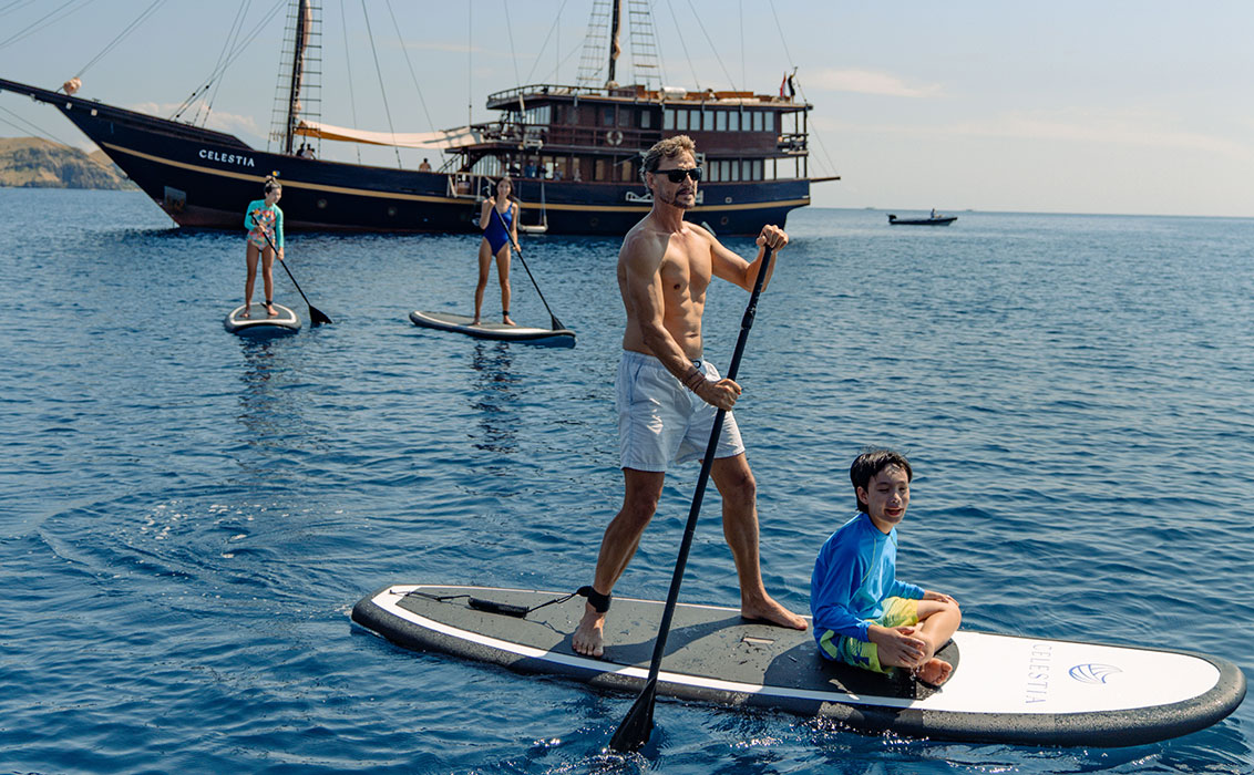 Other water-based activities available include snorkelling, paddle boarding, water-skiing, kayaking, and wakeboarding, with equipment available on board.