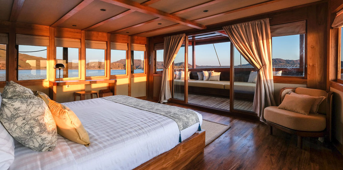 And those who select the upper deck cabins can savour stretching panoramic views of the archipelago in the utmost comfort and privacy, with nothing but the dramatic volcanic landscapes and lush tropical islets visible from the suites’ spectacular floor-to-ceiling windows and secluded private terraces.