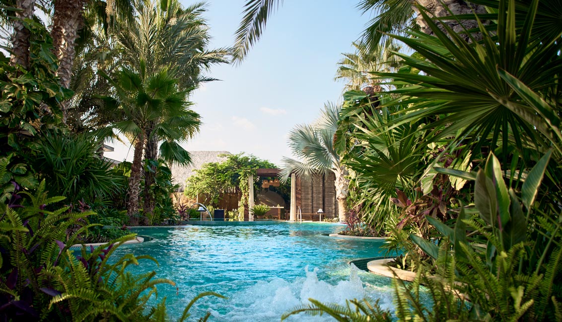 At 2,700 square metres (29,000 square feet), a tranquil pool fringed by lush, tropical palms and even more green foilage is the centrepiece, is traced by wooden boardwalks that lead to private treatment rooms, some of which cater for couples and small groups. Here, guests can participate in a modern version of the ancient Temazcal Experience within a heated dome that is said to cleanse the body, mind and soul, guided by a spiritual healer (Shaman). Other options include a Savasana sound healing experience. I opt for the firm (by choice) Zadún massage with essential oils, and I can feel Roxana kneading her elbows to release knots in my shoulders. I chose the citrus blend of oils, over the lavender and rosemary options.