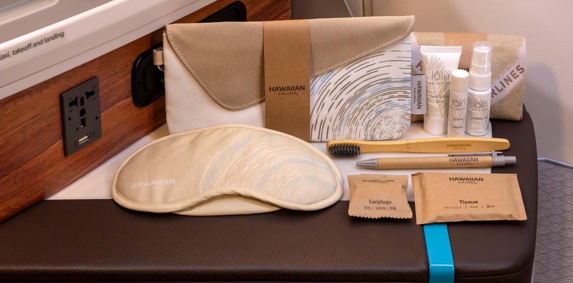 Beginning 6 November 2023, Business Class guests traveling on Hawaiian’s long-haul international flights and between Hawai‘i and New York, Boston and Austin will be offered amenities made with responsibly sourced materials. Guests will receive a recycled plastic canvas bag containing essential items and will be offered an assortment of additional amenities a la carte to minimise waste.