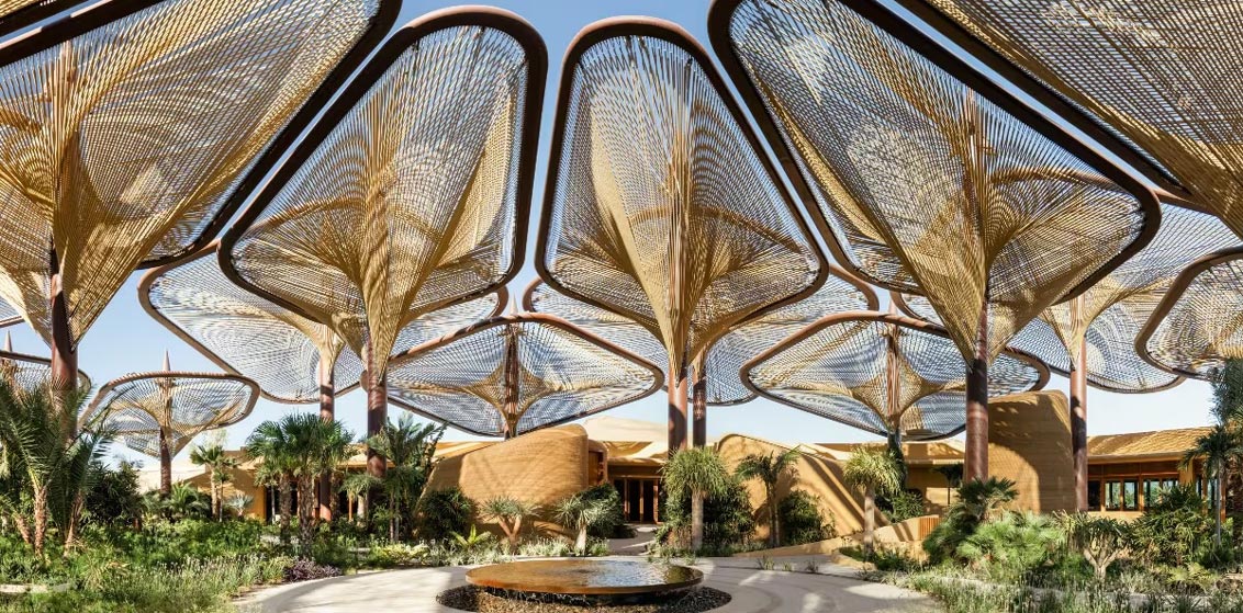 Lead image: The Oasis at the heart of Six Senses Southern Dunes, The Red Sea is inspired by a desert flower. The canopy is a self-shading structure, blurring the lines between the natural finishes inside and the native plants and water features outside.