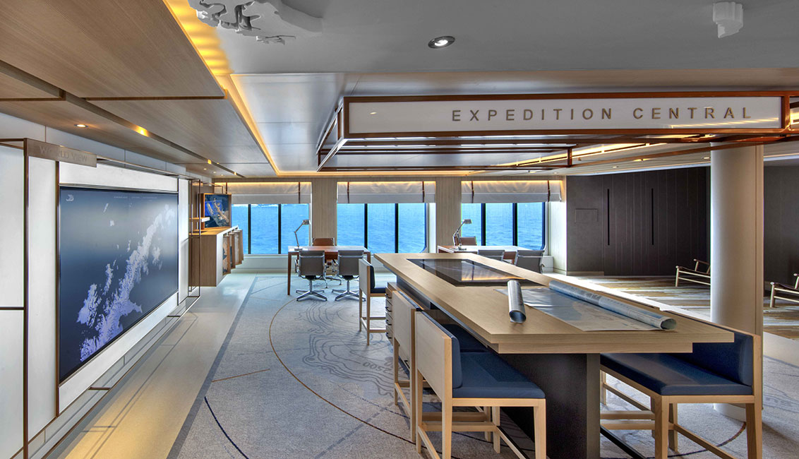 The hub for their expedition teams to consult with guests on their expedition activities and to share their knowledge about destinations on a one-on-one basis. With the aid of 3D printed maps, digital screens and a state-of-the-art spatial data visualisation chart table.
