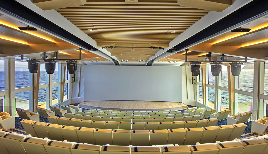 Setting a new standard, Viking has created the world’s most advanced venue for learning at sea. The Aula, a stunning panoramic auditorium, was inspired by the University of Oslo’s famed Aula ceremonial hall, which used to be the venue for the Nobel Peace Prize ceremony. This unique space features a 4K laser-projected panoramic screen spanning nearly the entire width of the room and is used for lectures, daily briefings, science presentations and films.