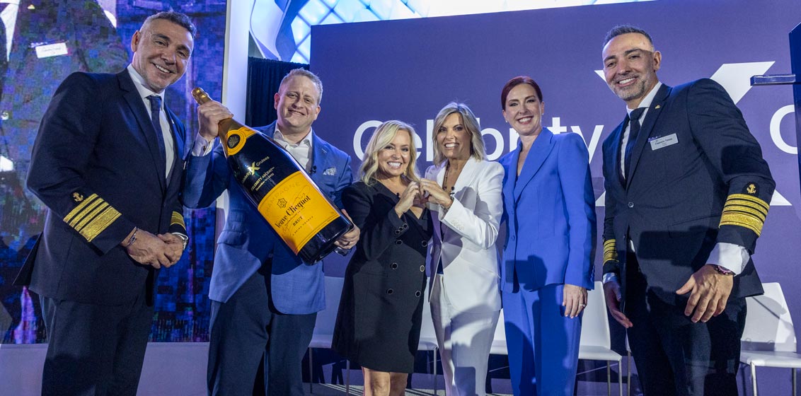 Lead image: Co-Godmothers Captain Sandy Yawn and Michelle Dunham flanked by Jason Liberty, Royal Caribbean Group President and CEO and Laura Hodges, President of Celebrity Cruises, flanked by Co-Captains, Dimitrios and Tasos Kafetzis.