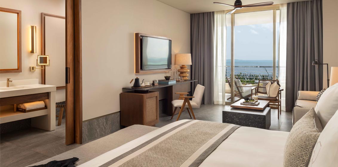 The complex features 35 residences and 100 oceanfront rooms and suites, each with private balconies and panoramic vistas of the turquoise Caribbean Sea, and luxurious bathrooms, all fitted with rain showers.