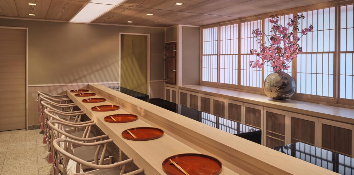 The restaurant’s bespoke design provides the perfect setting for a traditional omakase experience at either the nine-person counter or the adjacent four-person counter within a private dining room.
