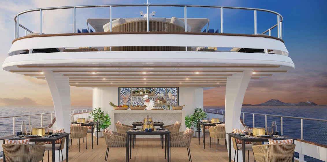 Guests will have a variety of outdoor open-air dining options to enjoy their gourmet meals from beneath the stars. The Sun Deck “provides an exclusive haven with comfortable sun lounges, a hot tub, and panoramic vistas,” the website boasts, and there will be a spectacular ocean bar offering sundowners with a view.