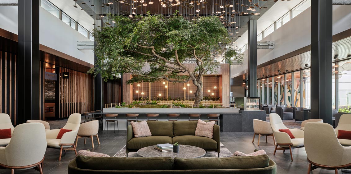 The design is inspired by Atlanta’s reputation as “the city in the forest” and its abundance of trees as well as American Express Card Members’ passion for wellness. The main seating area features a 50-year-old olive tree and a 360 square metre custom light sculpture that represents a forest canopy, creating a relaxing space for Card Members to unwind before their flights.