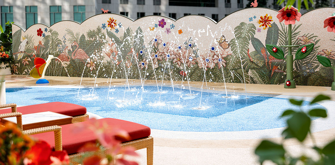 The hotel’s expansive 8th-floor pool deck now features an exclusive outdoor WATERPLAY area designed as a joyful space for families. Crafted with safety in mind for children up to the age of six, the area includes a toddler paddling pool, a splash park with a water tunnel, water jets, and LED lights, as well as playful flower sculptures and an interactive Whack-a-mole wall. These features can be activated to spray water in a riparian environment, creating an enchanting playground that sparks children’s imaginations. Luxury cabanas are available for guests to relax and enjoy Island Shangri-La Hotel’s poolside service. Guests on the 45th floor will also receive a pool bag with amenities, and additional supplies such as pool toys and swimming diapers are provided on the pool deck for added convenience.