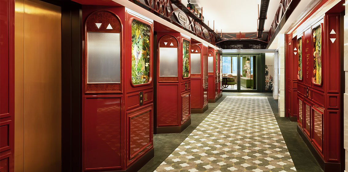 The adventure begins in the 45th floor lift lobby now transformed into a Hong Kong train station with a moving model train. Each corridor has either a garden or marine theme and leads to doors stencilled with local forest and marine animals designed to help younger guests find their Peak- or harbour-view getaway.