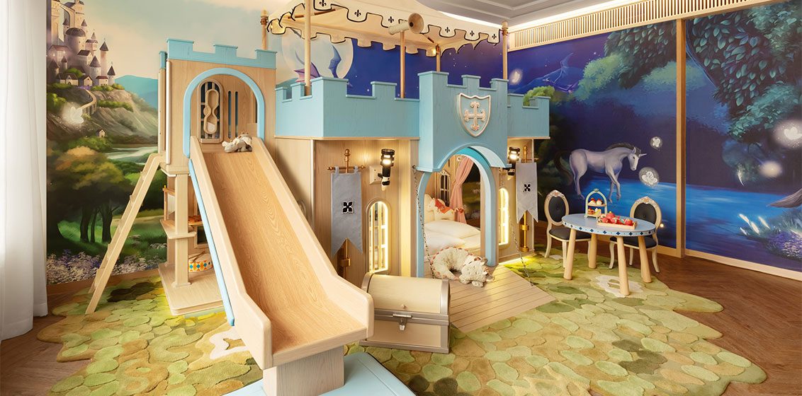 Enter a mystical world in the Fairy Garden suite where the pink pumpkin carriage bunk bed is in an enchanted mural landscape of colourful, larger-than-life wild plants, butterflies, and flowers, unicorns and toadstools. A whimsical table and chairs for tea parties, dress-up corners, and a treasure trove with a tea set for parties with fairy friends, and flowers, butterflies, and a magic wand complete the scene, while a projection on the ceiling transports young guests into an extraordinary and spellbinding garden complete with sound.