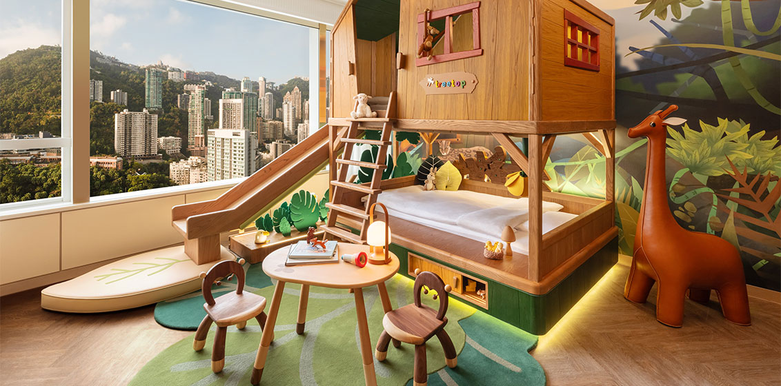 Learning and discovery go hand in hand with six exciting themed rooms for children that feature a slide, a personalised nameplate, interactive lights and sounds, a treasure trove of toys, and special outfits for role play. Hand-painted by a group of local artists, secret animals and motifs around the room are only visible in the beam of a special UV torch. The parents’ spacious, sophisticated ensuite bedroom reflects the nature theme with delicate embroidered details and elegant furnishings. It doubles as a family room and has a large pantry.The Hong Kong Wonders suite has a bunk bed that looks just like the iconic green trams that cross the city. There is a slide on the upper deck, and interactive panels with buttons and pedals allow children to control sounds and lights. Created by local artist Don Mark, the mural portrays Hong Kong’s iconic landmarks, vibrant neon lights, and rural landscapes.