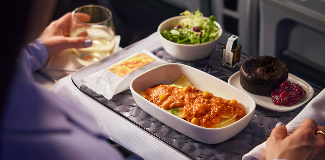 DPS customers traveling Los Angeles to Sydney can choose one main dish from two options: Chicken Parmesan with pomodoro sauce, broccoli and Cacio e Pepe Lasagne with bechamel sauce (vegetarian). Pre-arrival meal options include Cheddar Scrambled Egg with chicken date sausage, hashbrown casserole or Greek Yogurt with maple granola, almonds, pepitas, sunflower seeds (vegetarian).