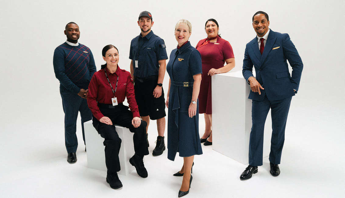 The uniform prototypes are anchored in deep navy blues and rich burgundy, with accents of bright red and white – a return to a more classic colour palette inspired by Delta’s brand identity and heritage.