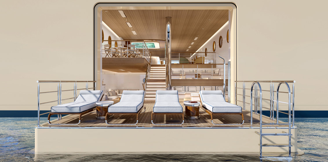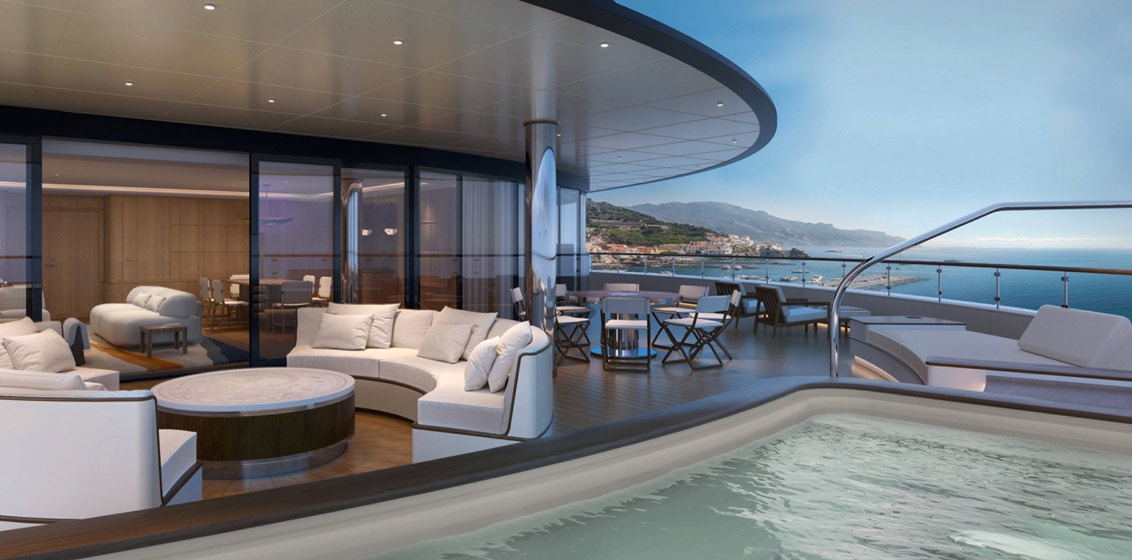 The Yacht’s extensive network of adjoining suites will feature an innovative system that connects accommodations with modular walls, offering numerous options of vertical and horizontal combinations within the signature suites. This versatility will unlock more than 100 different connection options and the unique opportunity to reserve an entire side of a deck, perfect for those travelling with family, friends, or larger groups. For example, this one-of-a-kind design will allow for more than 1,200 square metres of total living space.