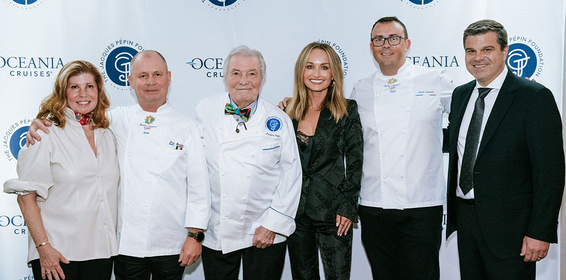 Lead image, from left are: Claudine Pépin, Chef Eric Barale, Chef Jacques Pépin, Giada De Laurentiis, Chef Alexis Quaretti and Frank A. Del Rio.